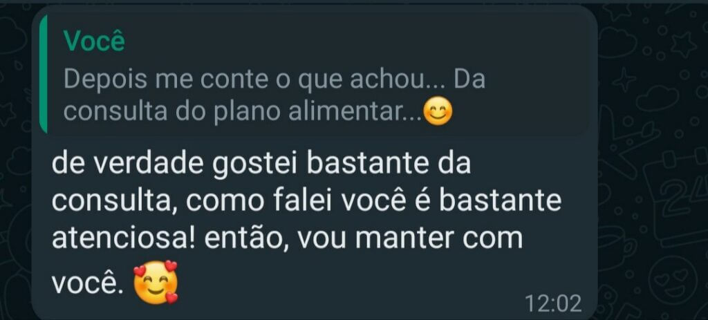 É aconselhável que a periodicidade entre consultas seja cerca de 30 à 45 dias, mas esse intervalo pode ser maior ou menor, a depender do grau de evolução do paciente na execução do seu plano alimentar. Mas não se preocupe, após a primeira consulta você irá dispor do meu whatsapp onde você vai poder tirar qualquer dúvida a qualquer momento do dia.